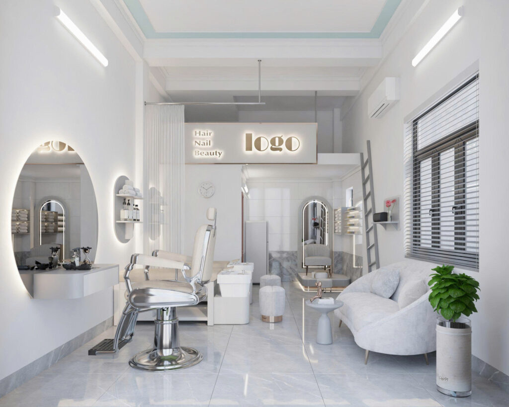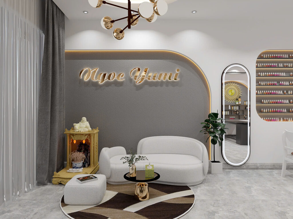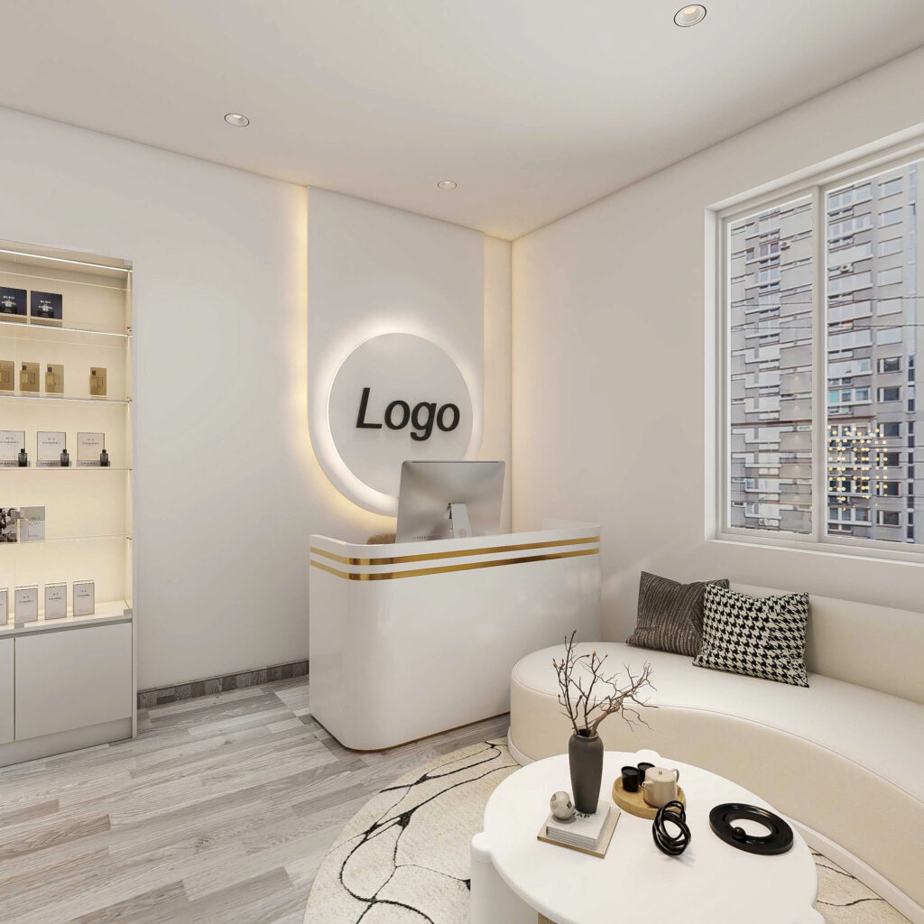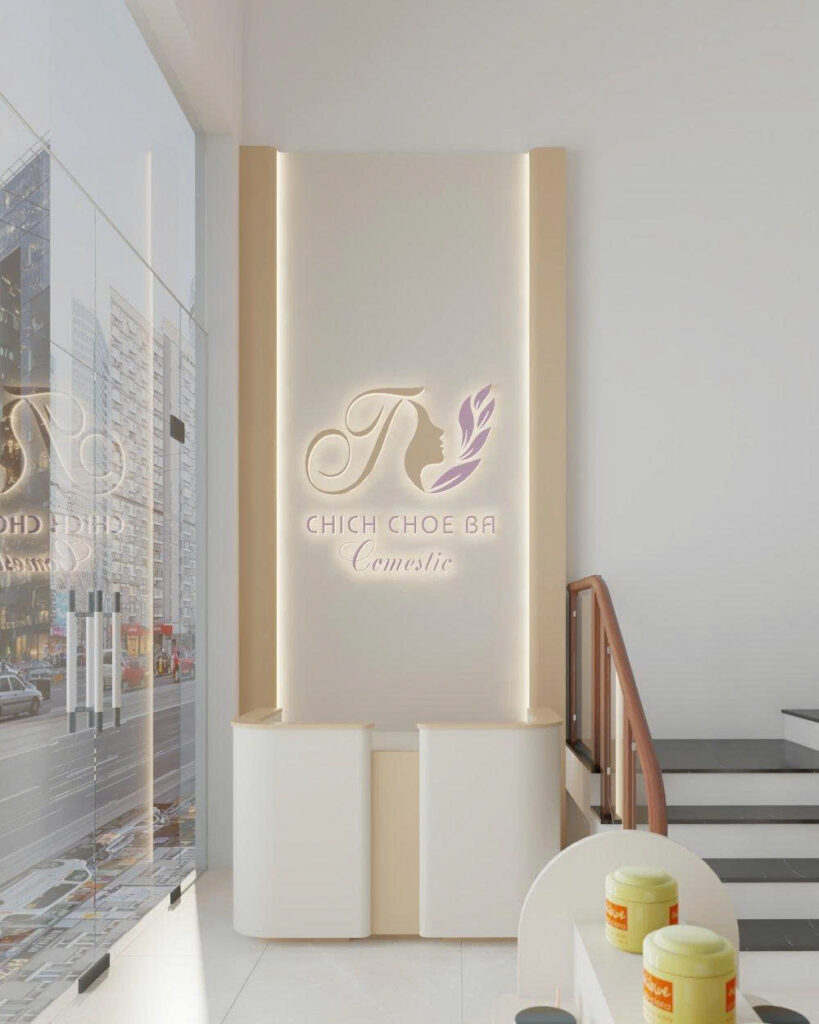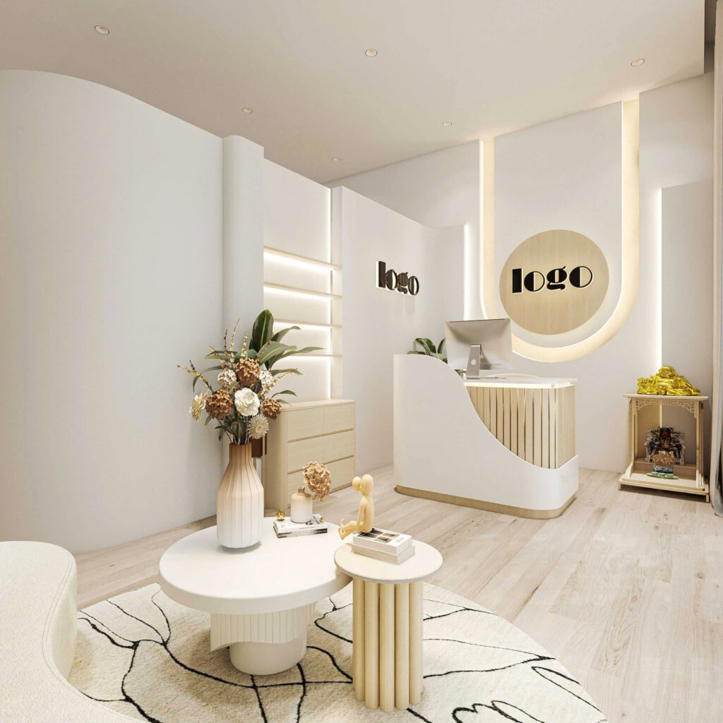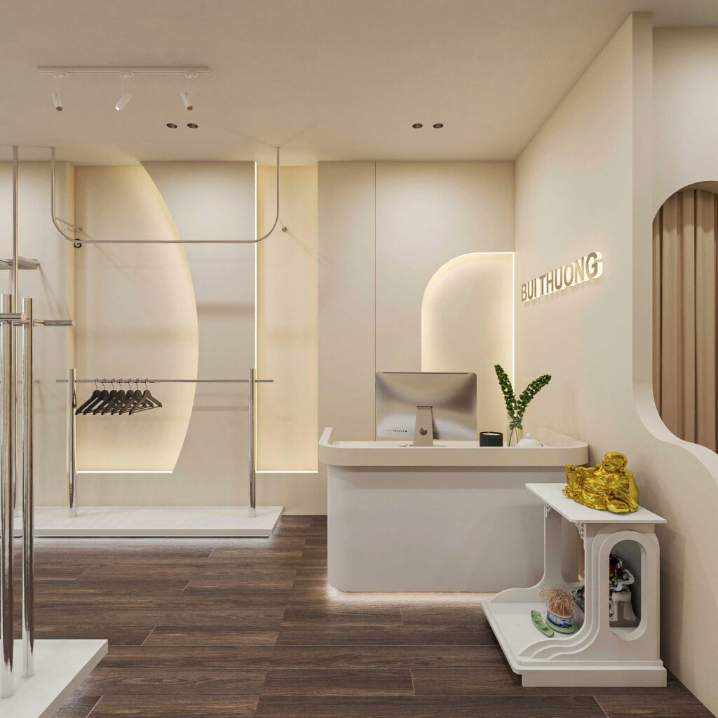 Để tăng tính trực quan trong không gian, nhà thiết kế lên ý tưởng sẽ sơn nền tường và lót gạch sàn đều màu trắng. Việc ứng dụng màu trắng trong thiết kế không chỉ tạo cảm giác không gian sâu, rộng còn tăng sự sang trọng của shop.
