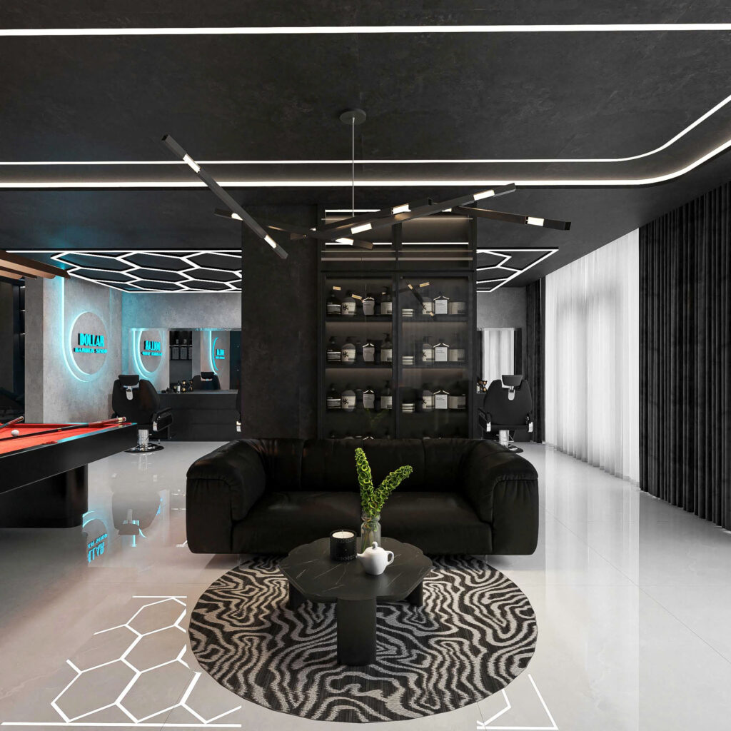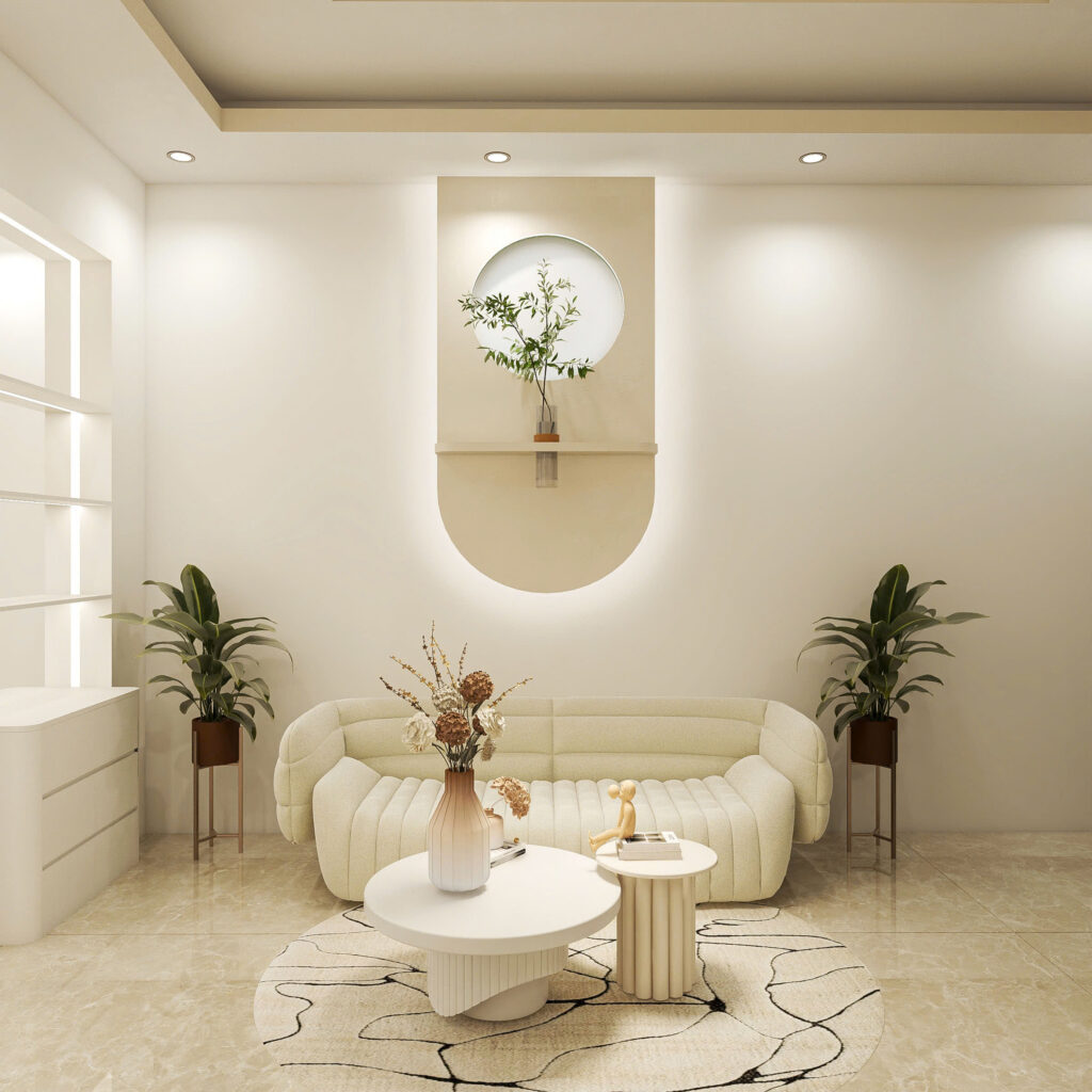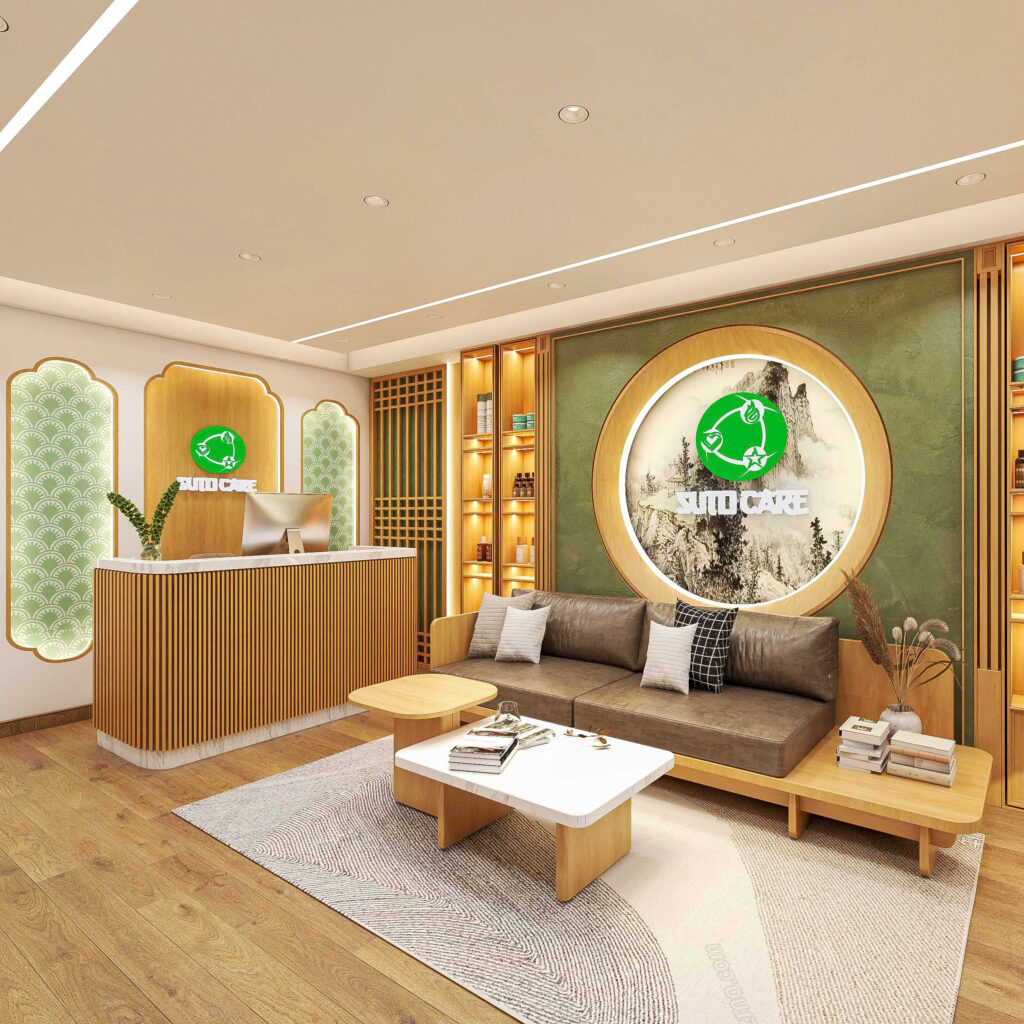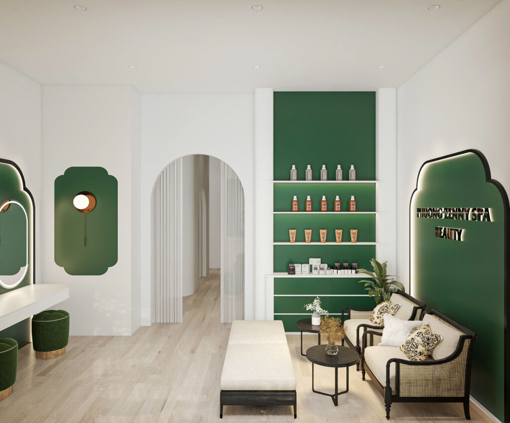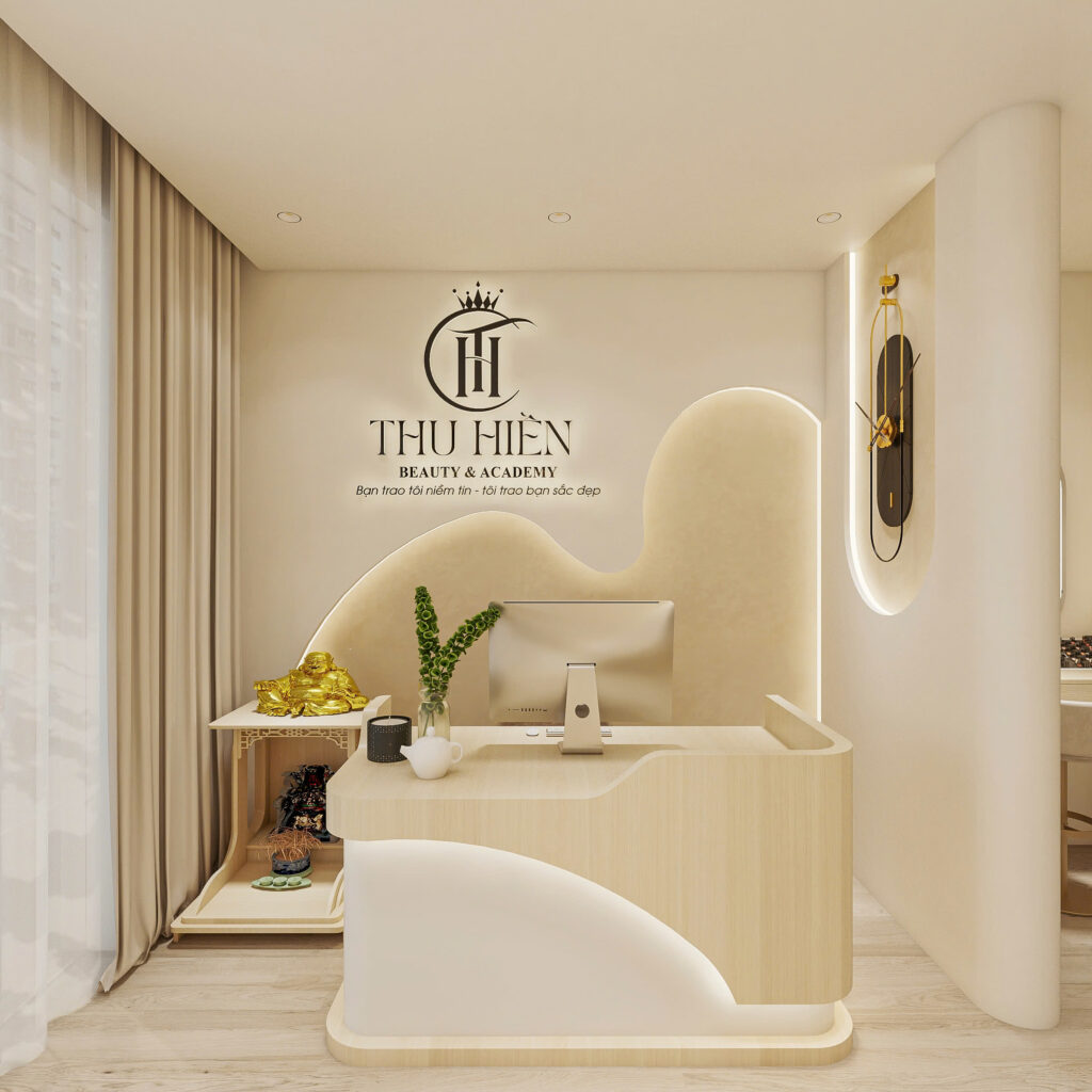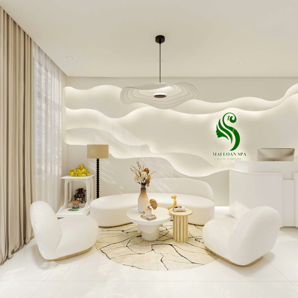 Để tăng tính trực quan trong không gian, nhà thiết kế lên ý tưởng sẽ sơn nền tường và lót gạch sàn đều màu trắng. Việc ứng dụng màu trắng trong thiết kế không chỉ tạo cảm giác không gian sâu, rộng còn tăng sự sang trọng của shop.